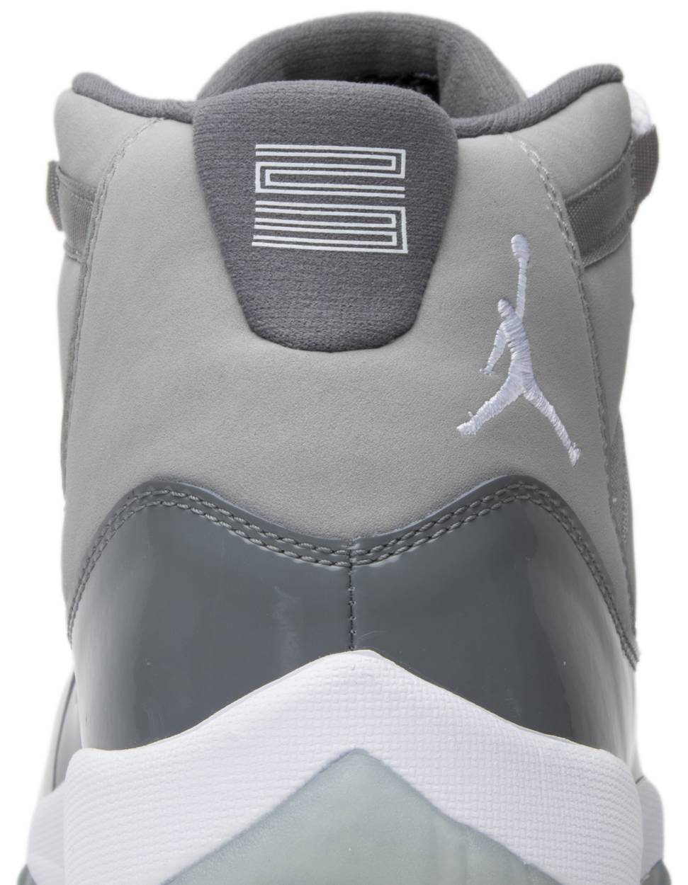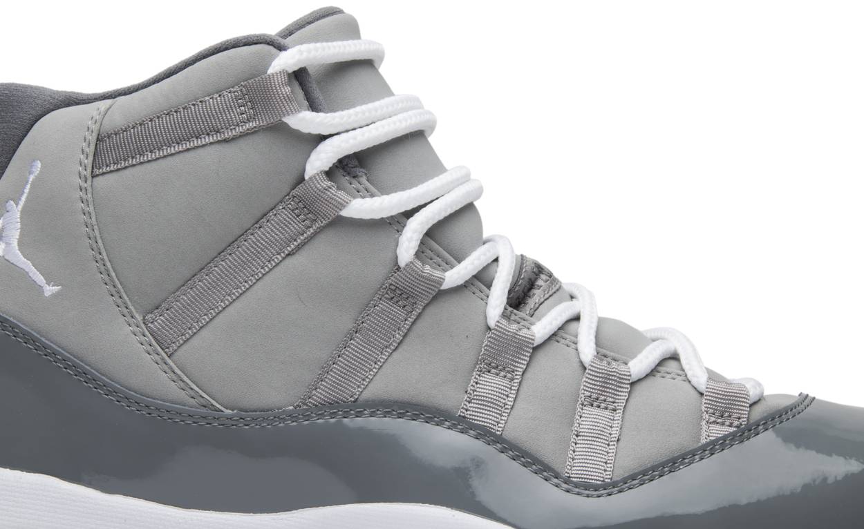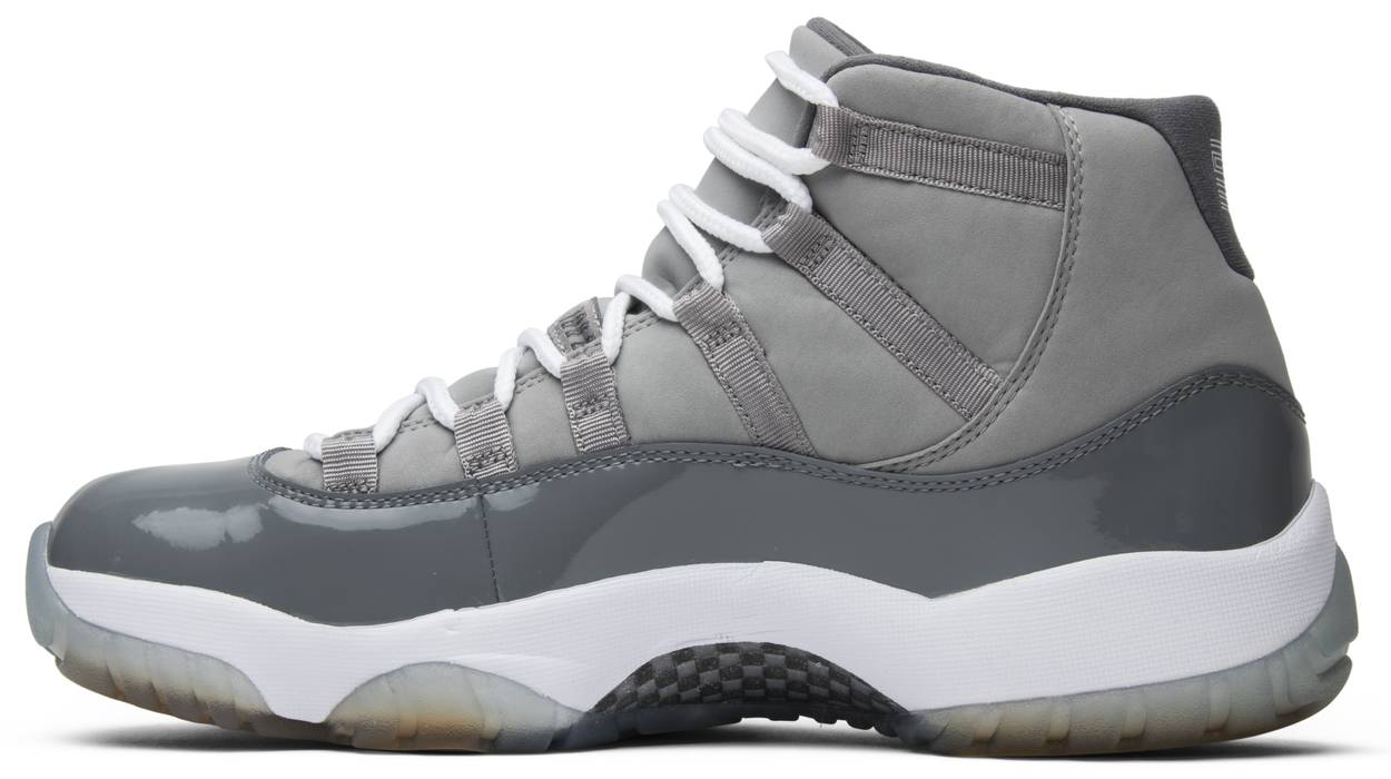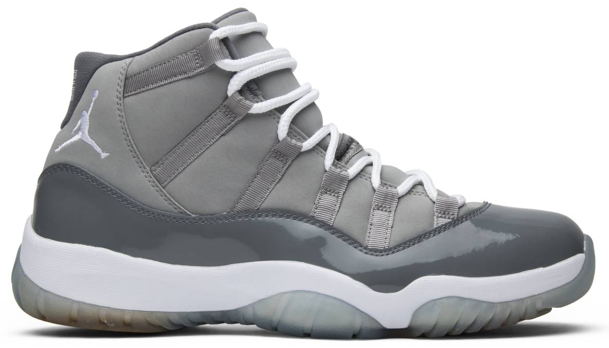 Relanzado en diciembre de 2010, el Air Jordan 11 Retro 'Cool Grey' 2010 presenta una parte superior de nubuck gris con superposiciones de charol gris. Lanzado originalmente en 2001, el diseño de la zapatilla también incluye una entresuela blanca y una suela translúcida azul hielo.