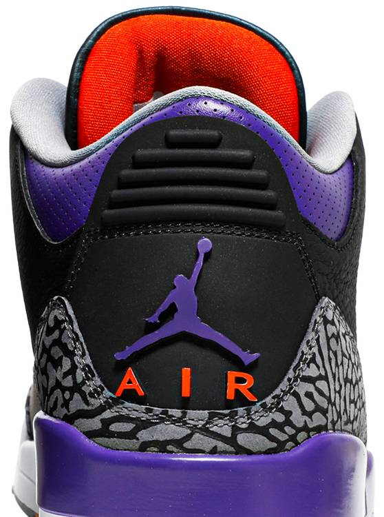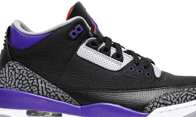 El Air Jordan 3 Retro 'Court Purple' hace uso de una parte superior de cuero caído negro con superposiciones de estampado de elefante en la puntera y el talón. Los acentos violetas se abren paso hasta el cuello acolchado, los ojales y la entresuela de dos tonos, con amortiguación Air visible en el talón. Estallidos inesperados de naranja vibrante se destacan en la lengüeta interior de la zapatilla y los elementos de la marca, resaltados por un ícono Jumpman en relieve sobre la lengüeta y el talón.