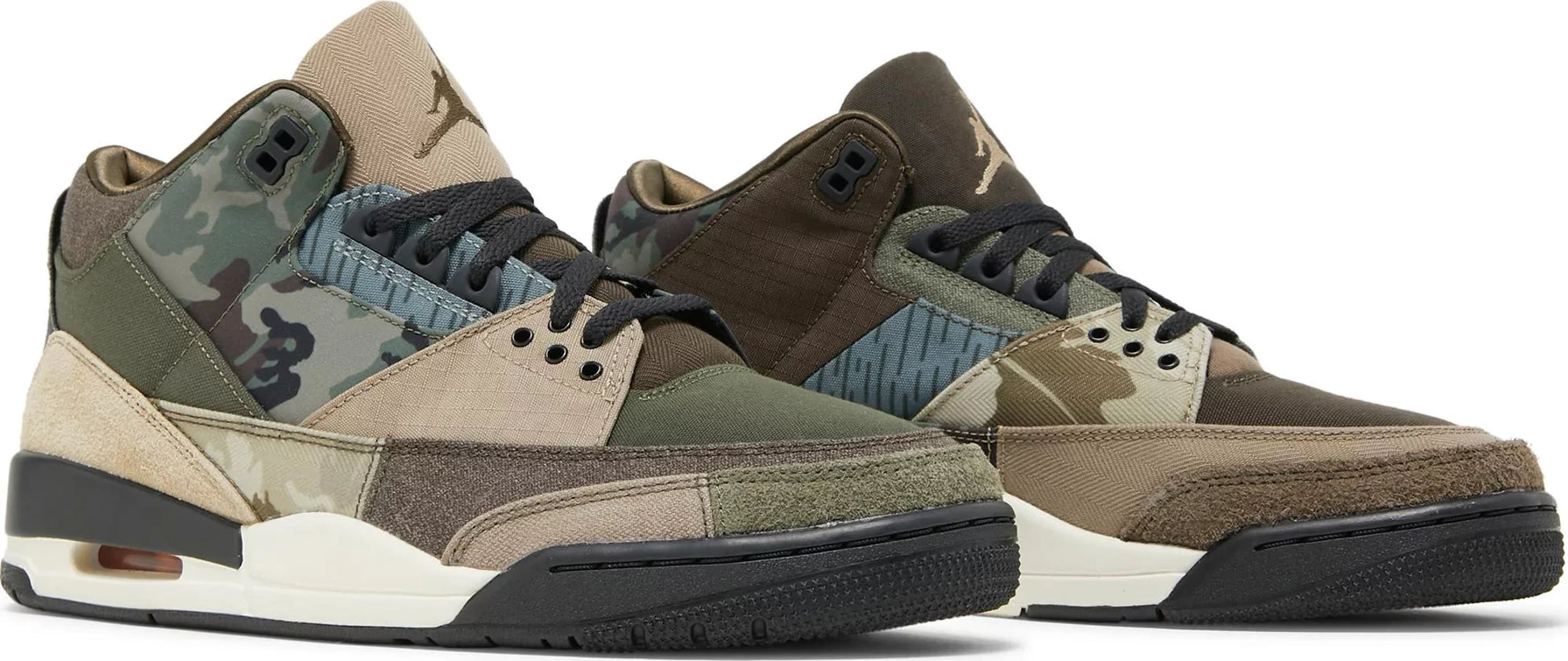 El Air Jordan 3 Retro 'Patchwork' actualiza el modelo icónico con materiales y estampados renovados. Un tono beige oscuro se ejecuta en la parte superior de lona y tela, reforzado con superposiciones contrastantes en verde musgo y camuflaje de bosque. El guardabarros segmentado presenta una mezcla de sarga de espiga beige y camuflaje de lluvia gris, mientras que la capa del talón de gamuza peluda se presenta en verde oliva. La lengüeta del talón ofrece oportunidades de personalización a través de parches de cierre de velcro extraíbles. La entresuela de poliuretano de dos tonos proporciona una amortiguación ligera con una unidad Air-sole teñida de rojo debajo del talón.