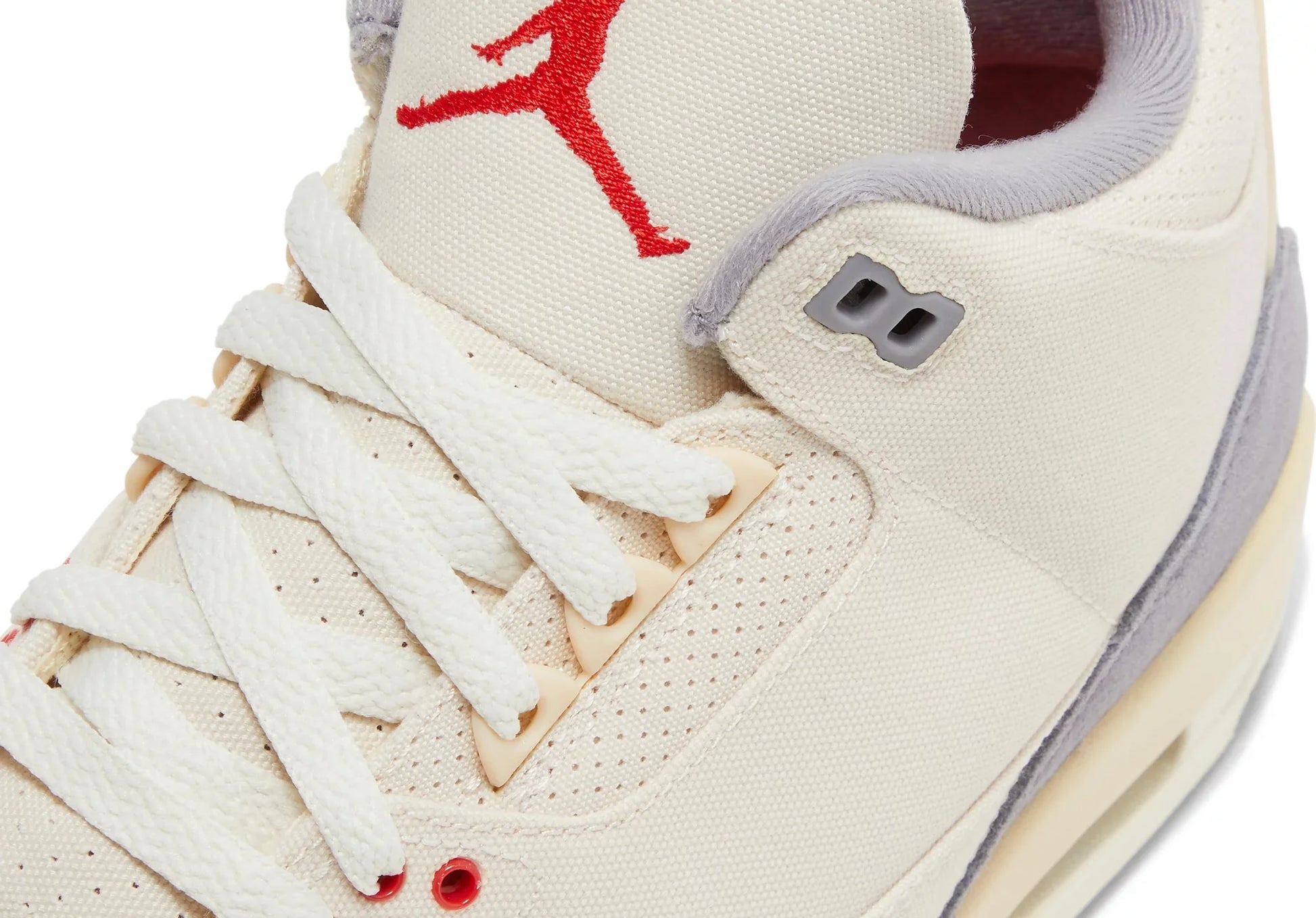 El Air Jordan 3 Retro SE 'Muslin' actualiza el diseño original de 1988 de Tinker Hatfield con una construcción rediseñada. En lugar del cuero tradicional, la parte superior está confeccionada con lona Muslin con refuerzos en la parte delantera del pie y el talón en gamuza gris cemento. Los acentos de University Red aterrizan en los ojales inferiores de la zapatilla, así como la marca Jumpman en la parte superior de la lengüeta y el panel del talón moldeado. La zapatilla se monta sobre una entresuela de poliuretano color hueso con amortiguación Air-sole visible en el talón. Bajo los pies, una suela exterior de goma gris duradera proporciona una tracción con agarre.