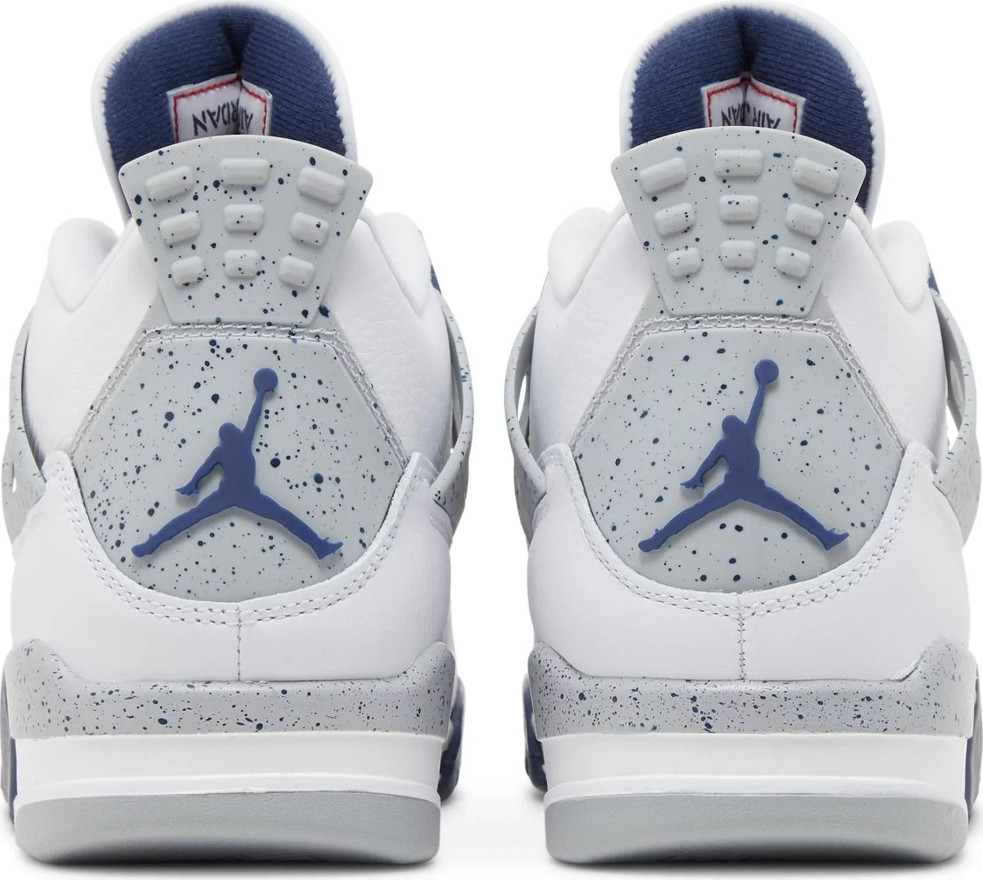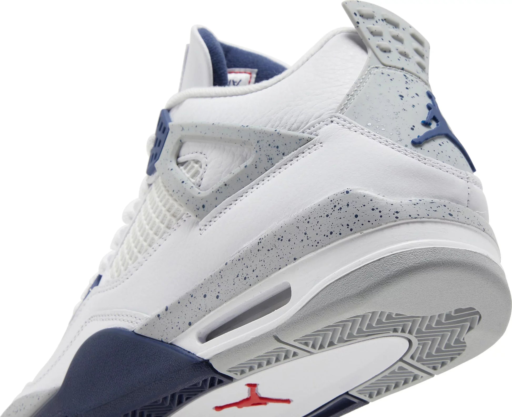 El Air Jordan 4 Retro 'Midnight Navy' viste la silueta heredada con el mismo bloque de color que se usa en la combinación de colores OG 'Fire Red'. La parte superior está confeccionada con cuero blanco con alas de soporte negras, una lengüeta negra en el talón a juego con la marca Jumpman en relieve y ojales moldeados en azul marino. Un segundo ícono de Jumpman adorna la etiqueta de la lengüeta tejida en carmesí. La zapatilla se monta en una entresuela de poliuretano de dos tonos, con Air encapsulado en la parte delantera del pie y una unidad visible en el talón.