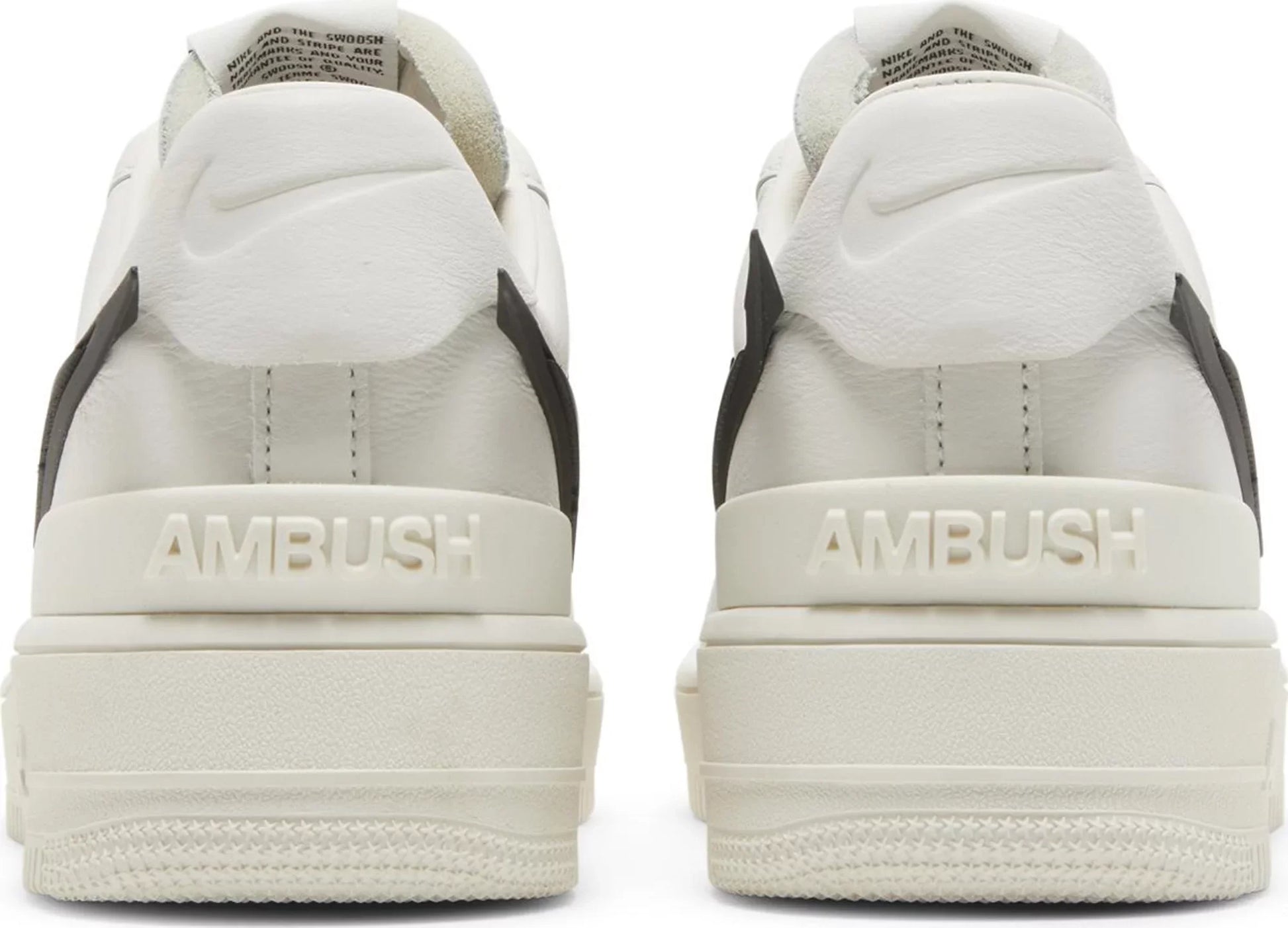 La zapatilla cuenta con cuero de primera calidad en la base y superposiciones en Phantom con el Swoosh exagerado característico de AMBUSH visto en los lados medial y lateral. La marca compartida se ve en la etiqueta de la lengüeta con un dubrae de encaje negro y la marca AMBUSH se ve en el clip del talón y Phantom se ve nuevamente en la entresuela y la suela exterior para rematar la zapatilla.