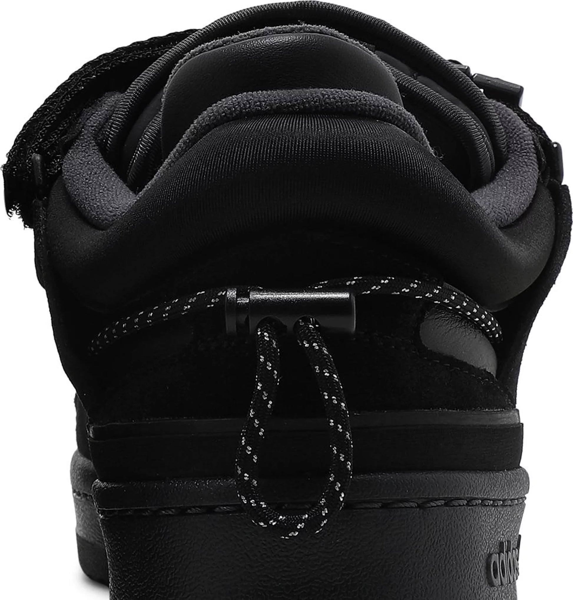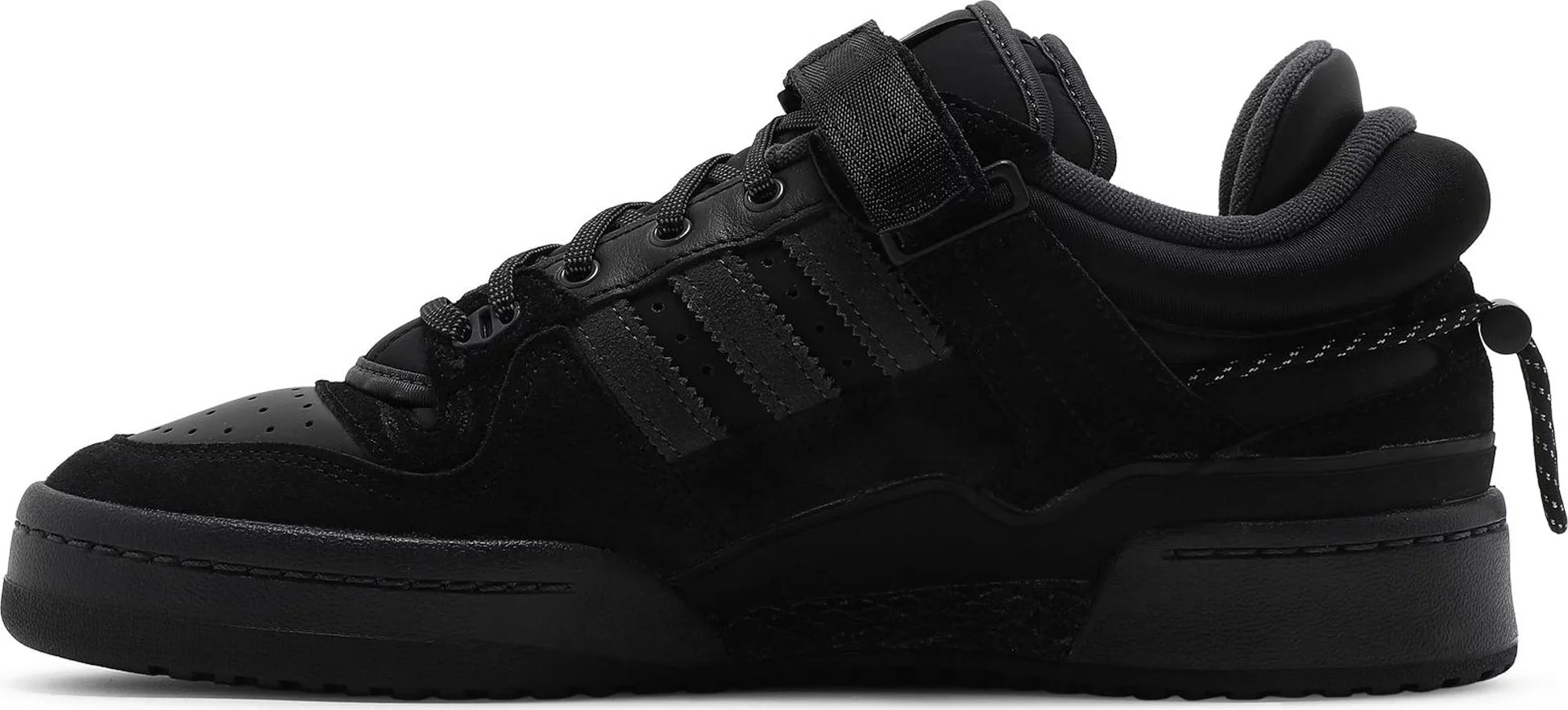 El Bad Bunny x adidas Forum Buckle Low 'Back To School' ofrece la interpretación sigilosa del artista latino del zapato de baloncesto vintage. La parte superior oscurecida, hecha en una mezcla de cuero, gamuza y tela, está asegurada con una combinación de cordones tradicionales, una correa extraíble con hebilla y un cordón envolvente y cierre de cordones en el talón. La construcción de doble lengüeta hace un guiño al bilingüismo de Bad Bunny, con la etiqueta de la lengüeta superior con el gráfico del tercer ojo que se ve en la portada del álbum debut del artista. La zapatilla está montada en una suela de goma negra a juego con una cuña de EVA expuesta en el lado medial.