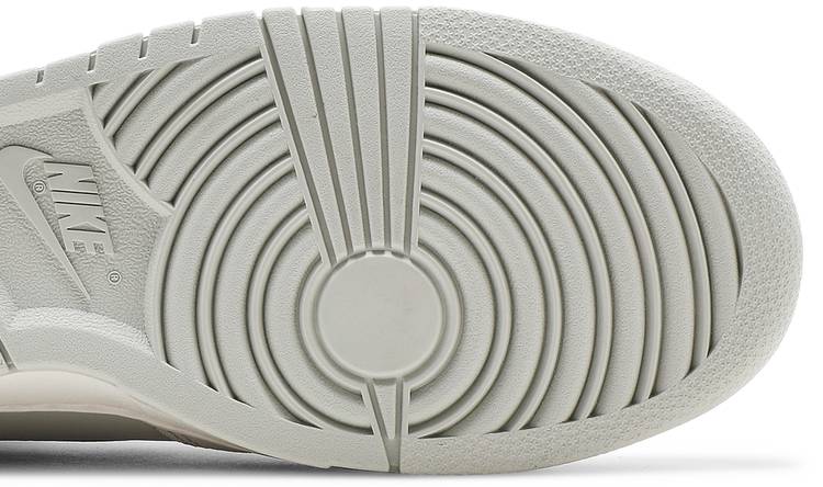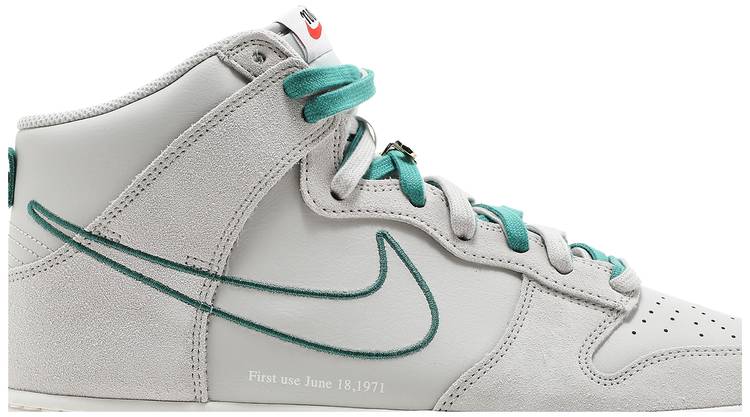 El Nike Dunk High SE 'Green Noise' se toma del 'First Use Pack', que celebra el 50 aniversario del logotipo de Swoosh. La parte superior hace uso de una parte superior de cuero blanco roto con superposiciones de gamuza tonal y un Swoosh de cuero verde en el lado medial. Un Swoosh retro delineado en un bordado verde atraviesa el lateral de la zapatilla, acompañado de un texto impreso que dice "Primer uso el 18 de junio de 1971". Los cordones dobles en blanco y verde están decorados con una joya de encaje en forma de Swoosh en un brillante acabado dorado metálico.