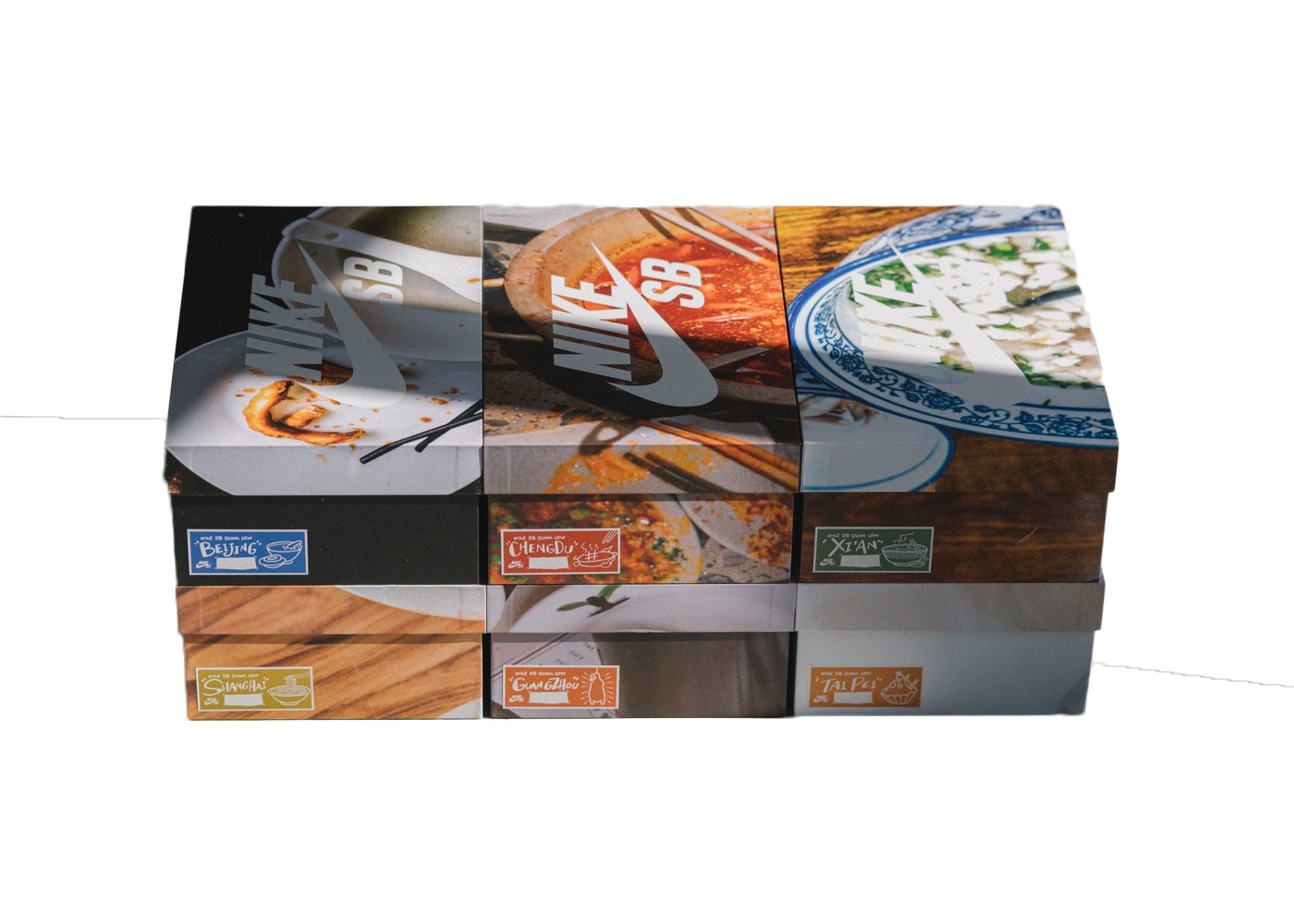 Diseñado por el artista de Guangzhou, Jason Deng x Nike Dunk Low Pro SB 'Street Hawker' rinde homenaje a los vendedores ambulantes de comida china y a la cultura gastronómica china en general. Las partes superiores deportivas bajas no combinan cubiertas con materiales, colores y gráficos de acuarela únicos de Deng, los detalles individuales que representan seis platos regionales de seis ciudades chinas. A ellos se unen otros adornos inspirados en la cocina, que incluyen un Swoosh de vetas de madera que hace un gesto con la cabeza a los palillos, una plantilla teñida de azul que representa cuencos de porcelana y una puntera cobriza que sustituye al aceite de chile hirviendo. En cada pestaña del talón, la palabra "comida" está escrita con caligrafía china bordada.