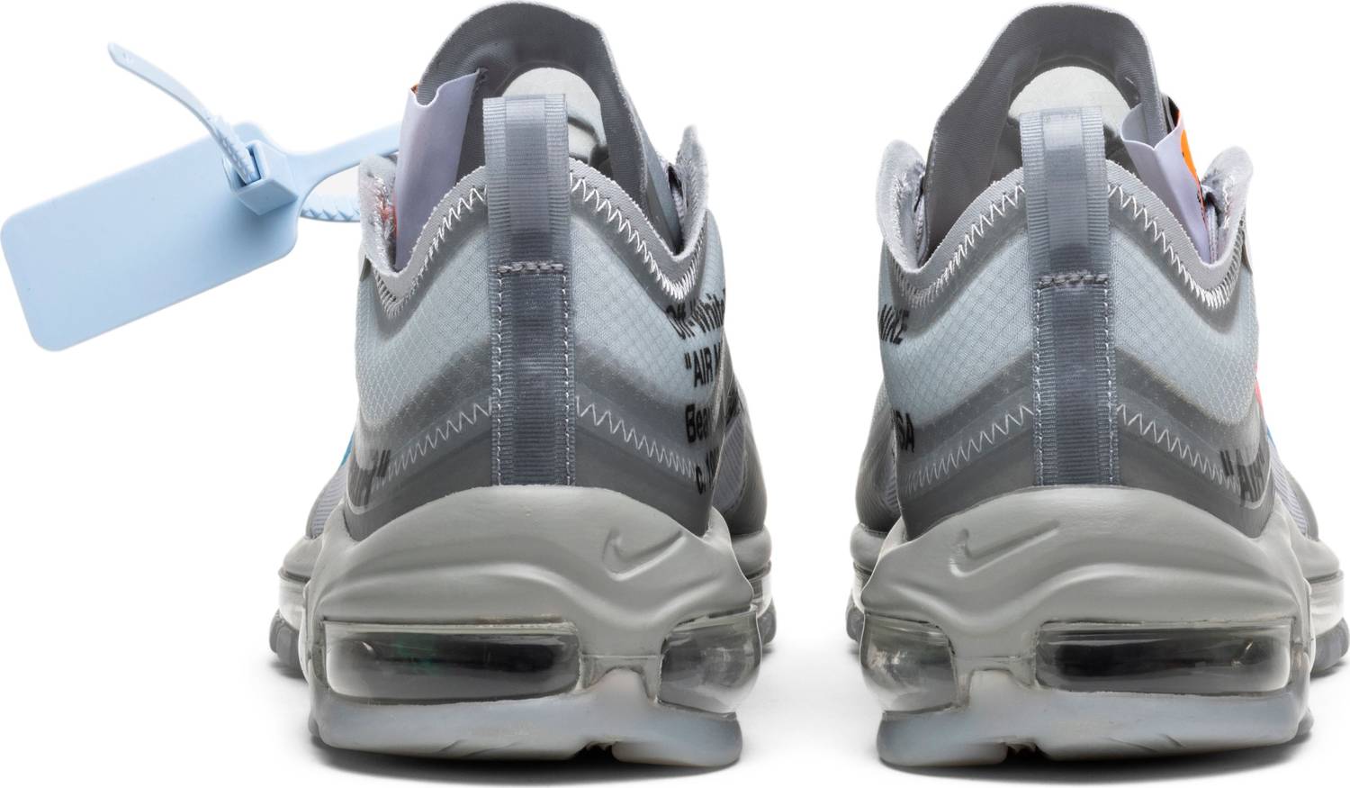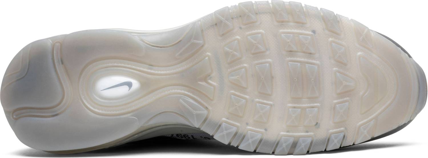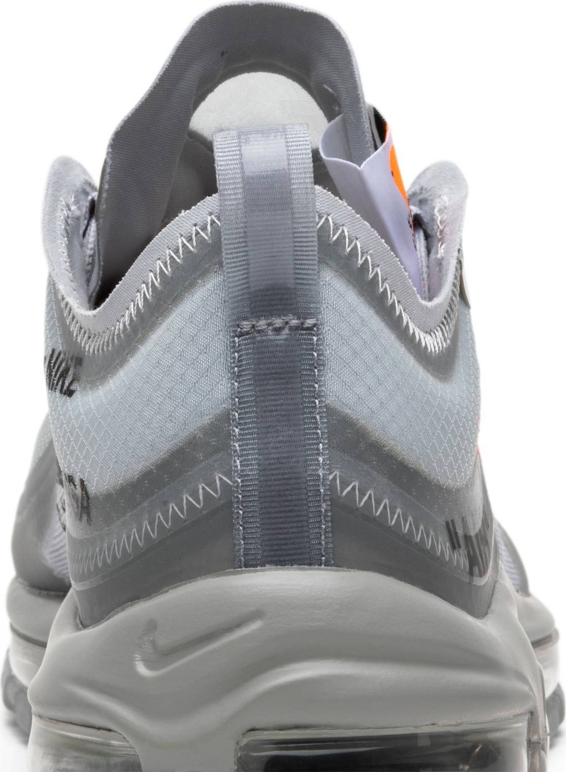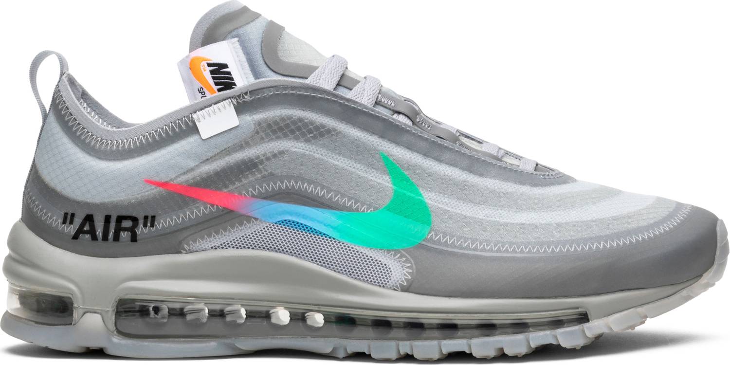 El 'Menta' de OFF-WHITE x Air Max 97 presenta una parte superior de tela translúcida terminada en Wolf Grey, complementada con el texto de la firma de Virgil Abloh y la costura en zigzag tonal en todas partes. La combinación de colores neutros se ve interrumpida por un Swoosh multicolor que hace la transición del verde al azul y al rojo, mientras que debajo del pie, una suela exterior de caucho gris ahumado mantiene el tema traslúcido del zapato.