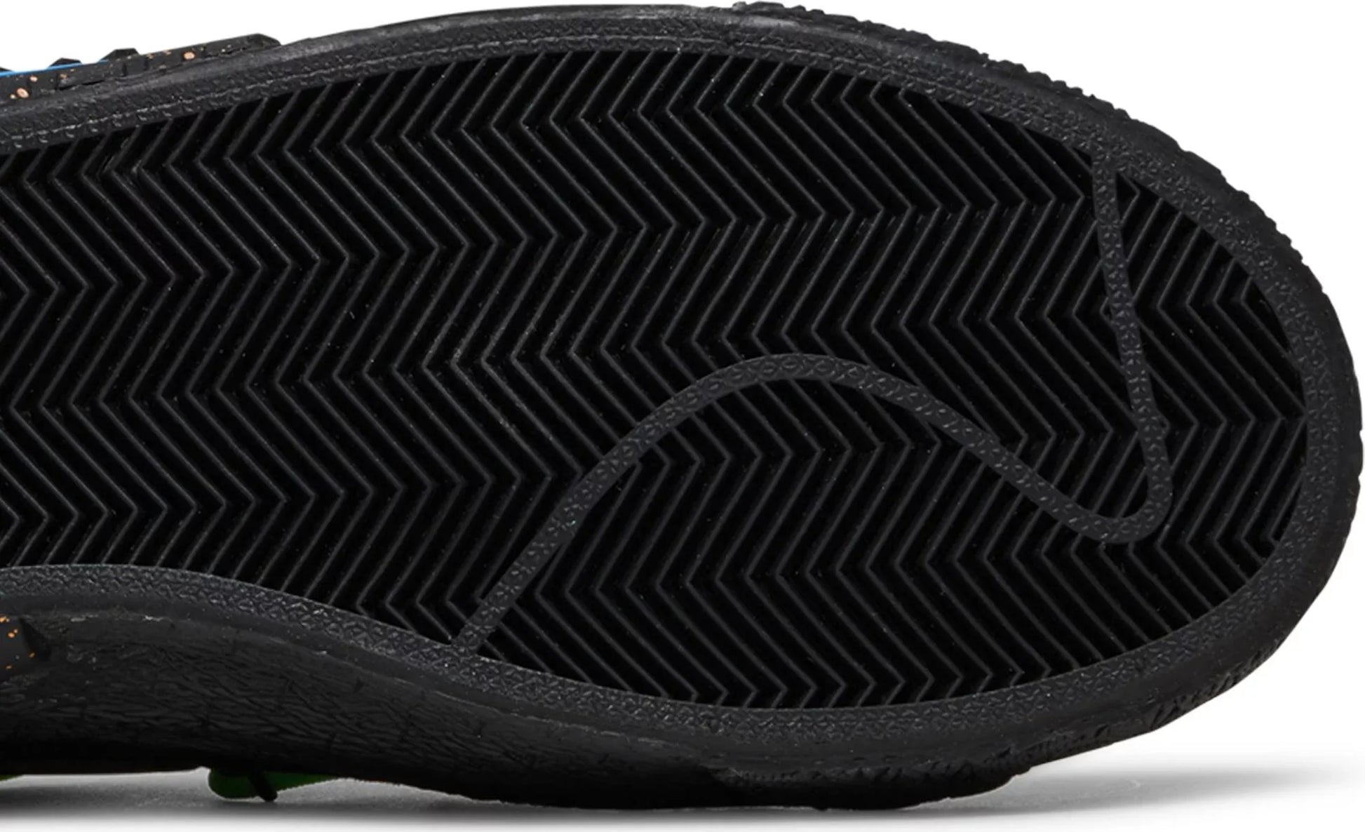El Off-White x Nike Blazer Low 'Black' transforma la silueta vintage con un enfoque multidisciplinario que se basa en la amplia herencia de Nike en baloncesto, skateboarding y trail running. Trabajando con el equipo de diseño de Nike, Virgil Abloh presentó una plataforma renovada que combina caucho negro vulcanizado con una pieza de talón de TPU inspirada en Air Terra Humara. La parte superior de cuero negro está acentuada con recortes circulares, un sistema de cordones suplementario en verde brillante y los adornos característicos de Abloh, que incluyen una corbata de plástico y un texto Helvetica impreso en el lado medio.