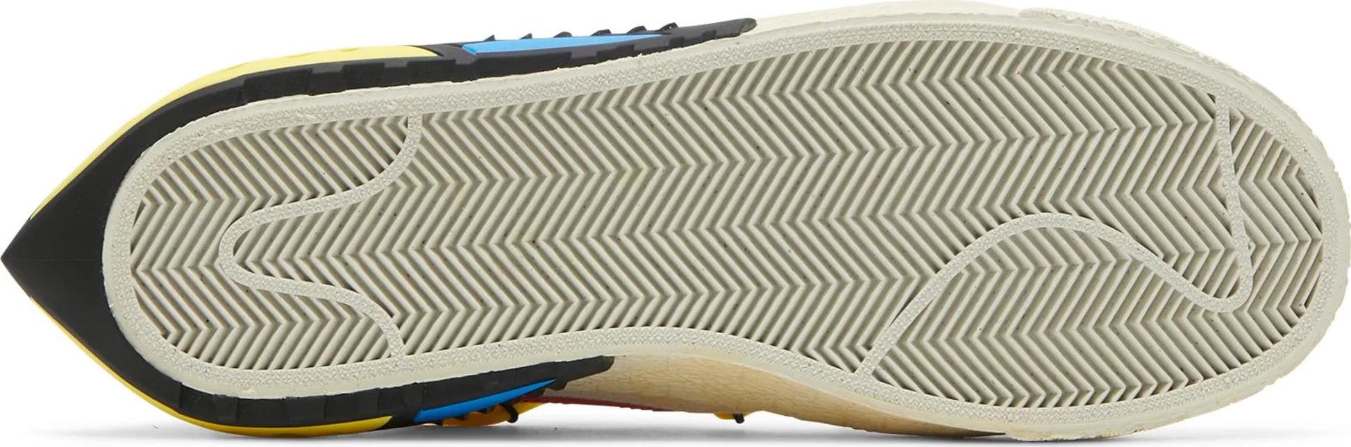 El Off-White x Nike Blazer Low 'White University Red' ofrece la versión radical de Virgil Abloh de la silueta clásica. Cordón amarillo suplementario serpentea a lo largo de la parte superior de cuero blanco, con una serie de recortes circulares y la marca Swoosh carmesí. Las etiquetas tejidas muestran la marca 'Nike Off' sobre las lengüetas de espuma expuestas, mientras que el texto serigrafiado característico de Off-White está pegado en el lado medio de la zapatilla. Apoyando la parte superior baja hay una entresuela de goma texturizada, con un acabado vintage preamarilleado que se ve interrumpido por una pieza amarilla moldeada que se extiende más allá del talón.