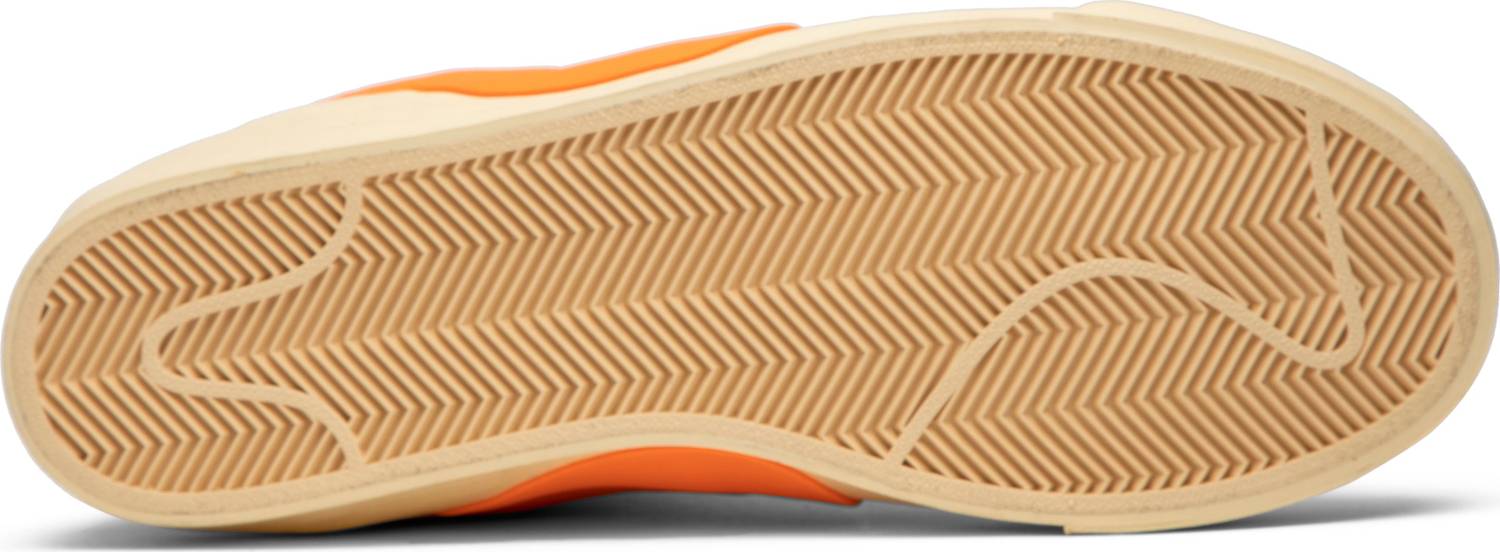 El OFF-WHITE x Blazer Mid ‘All Hallows Eve’ muestra un Swoosh naranja apropiado para la estación sobre una base de pale Vanilla. El tono de color canela amarillento se extiende a la lengüeta de espuma expuesta y la entresuela de goma, con el cierre de cremallera en azul que agrega un toque de color en contraste. Las líneas de texto de la firma de Virgil Abloh registran una aparición en el panel del cuarto del lado medial.