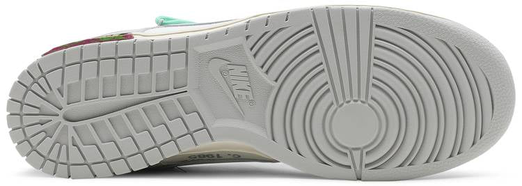 Estas zapatillas Off-White x Nike Dunk Low están tomadas de la colección 'Dear Summer', una continuación en expansión de la primera colaboración Nike Dunk de Virgil Abloh de 2019. Las zapatillas bajas utilizan una parte superior de cuero blanco con superposiciones de lona gris suave, junto con las florituras de la tarjeta de visita de Virgil Abloh, que incluyen una corbata de plástico y un texto Helvetica impreso.