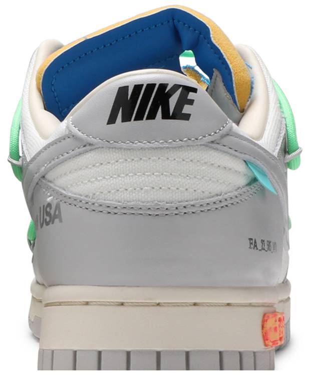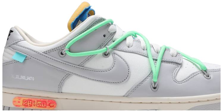 Estas zapatillas Off-White x Nike Dunk Low están tomadas de la colección 'Dear Summer', una continuación en expansión de la primera colaboración Nike Dunk de Virgil Abloh de 2019. Las zapatillas bajas utilizan una parte superior de cuero blanco con superposiciones de lona gris suave, junto con las florituras de la tarjeta de visita de Virgil Abloh, que incluyen una corbata de plástico y un texto Helvetica impreso.