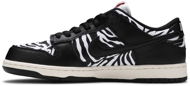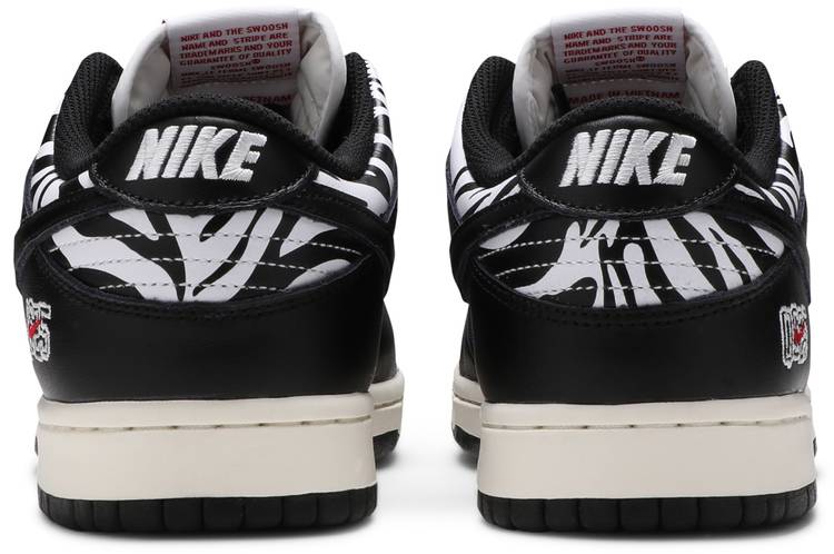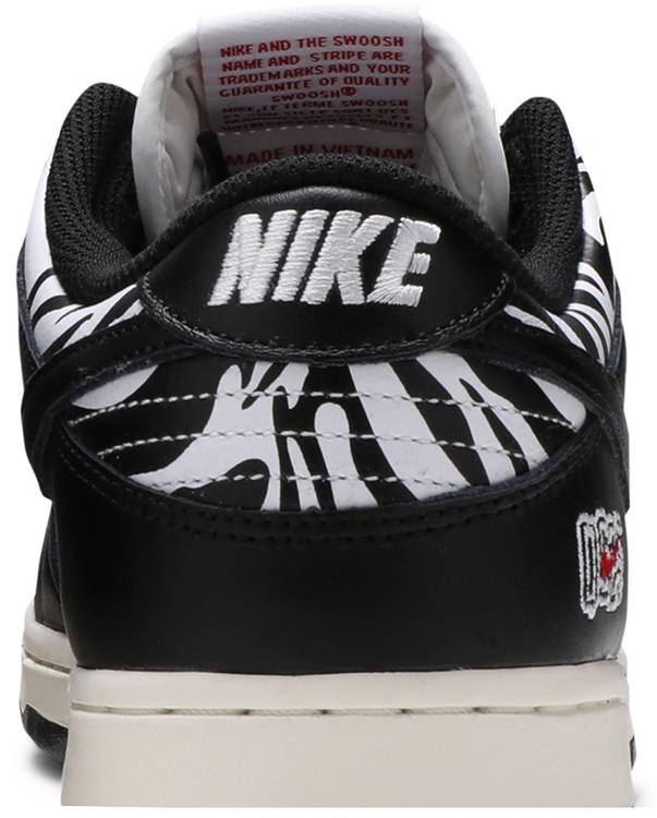 Los Quartersnacks x Nike Dunk Low SB 'Little Debbie's Zebra Cakes' representan una de las múltiples colaboraciones de Dunk que celebran los Juegos Olímpicos de Verano de 2021 en Tokio, donde el skateboard hace su debut como deporte olímpico. Cortesía de la revista en línea dedicada al skateboarding en la ciudad de Nueva York, la zapatilla se inspira en Little Debbie Zebra Cakes, el bocadillo elegido por los patinadores en movimiento. La parte superior de cuero presenta rayas de cebra en blanco y negro en la puntera, el panel lateral y el cuello. Las superposiciones de cuero negro sólido envuelven el antepié y el talón, este último con la marca Quartersnacks bordada en el lateral.