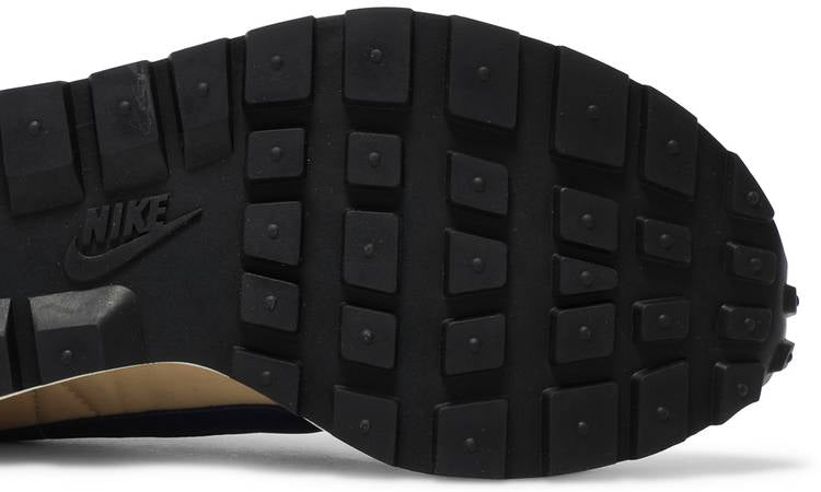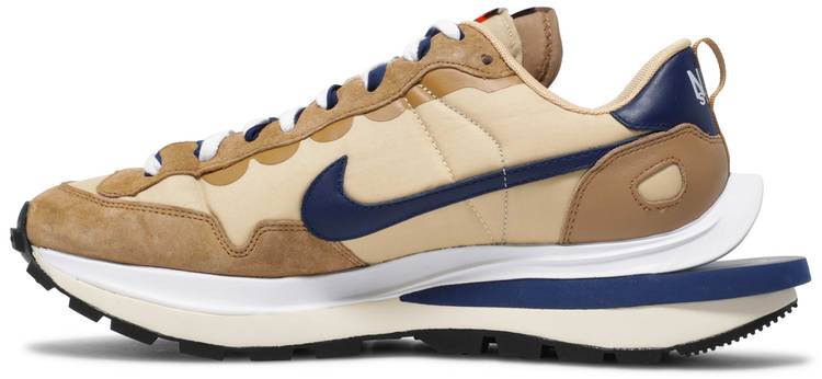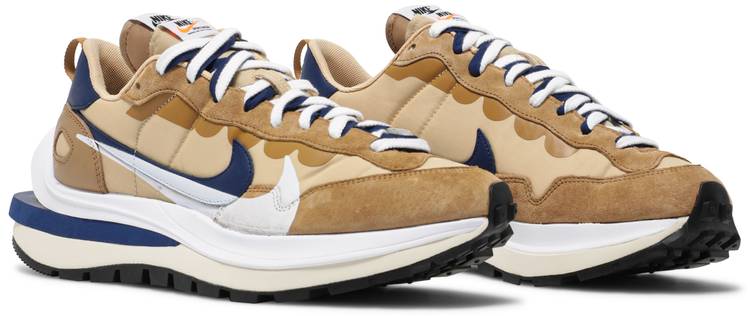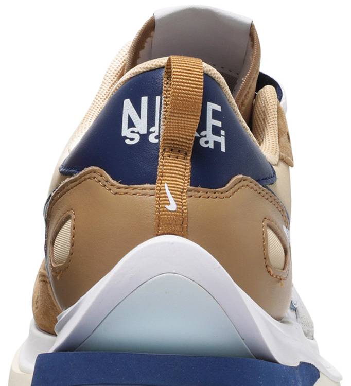 El sacai x Nike VaporWaffle 'Sesame Blue Void' reúne al Swoosh con la marca de moda con sede en Tokio dirigida por Chitose Abe. Combinando elementos del moderno Vaporfly y el corredor vintage Pegasus de 1983, la silueta híbrida hace uso de una parte superior textil de color caqui con superposiciones de cuero y gamuza a tono. Un Swoosh de cuero azul se une a un Swoosh impreso más grande en blanco contrastante. Las lenguas están igualmente dobladas, cada una acentuada con una etiqueta Nike tejida. La zapatilla se monta en una entresuela de espuma de doble capa, con detalles de talón dividido y soportada por una suela clásica con dibujo de gofre.
