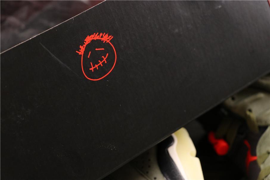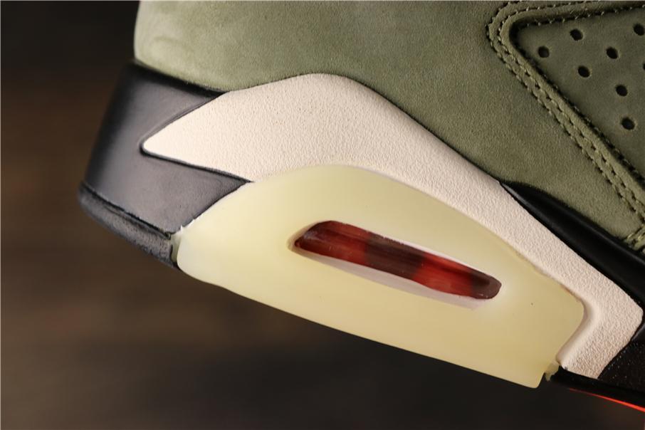 El Travis Scott x Air Jordan 6 Retro 'Olive' representa una colaboración entre el rapero con sede en Houston y Jordan Brand. Esta versión del AJ 6, que Scott debutó mientras actuaba durante el medio tiempo del Super Bowl 53, lanzado en octubre de 2019. Cuenta con una combinación de colores Medium Olive, black, Sail y University Red junto con varios elementos únicos: un bolsillo pequeño con un broche de presión el cuello, una parte superior de nobuck y gamuza, el logo 'Cactus Jack' de Scott en el talón y una suela exterior translúcida que brilla en la oscuridad.
